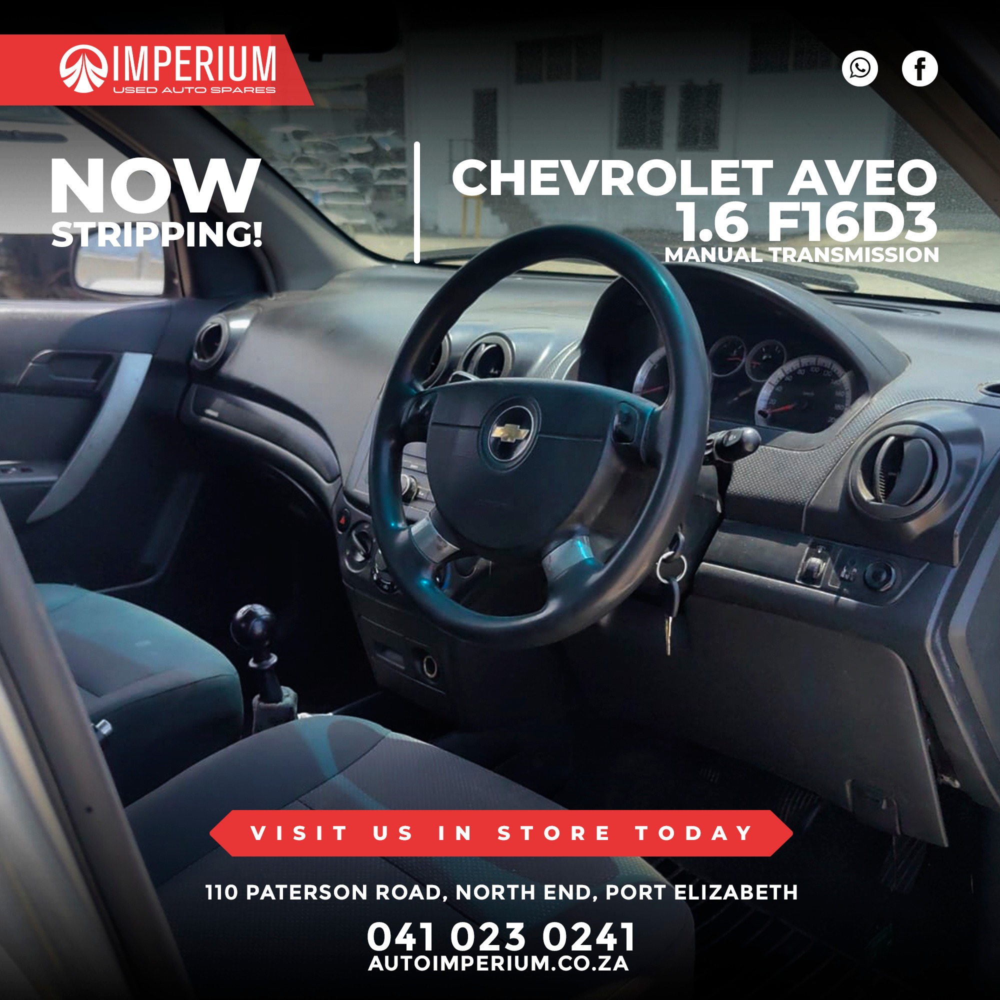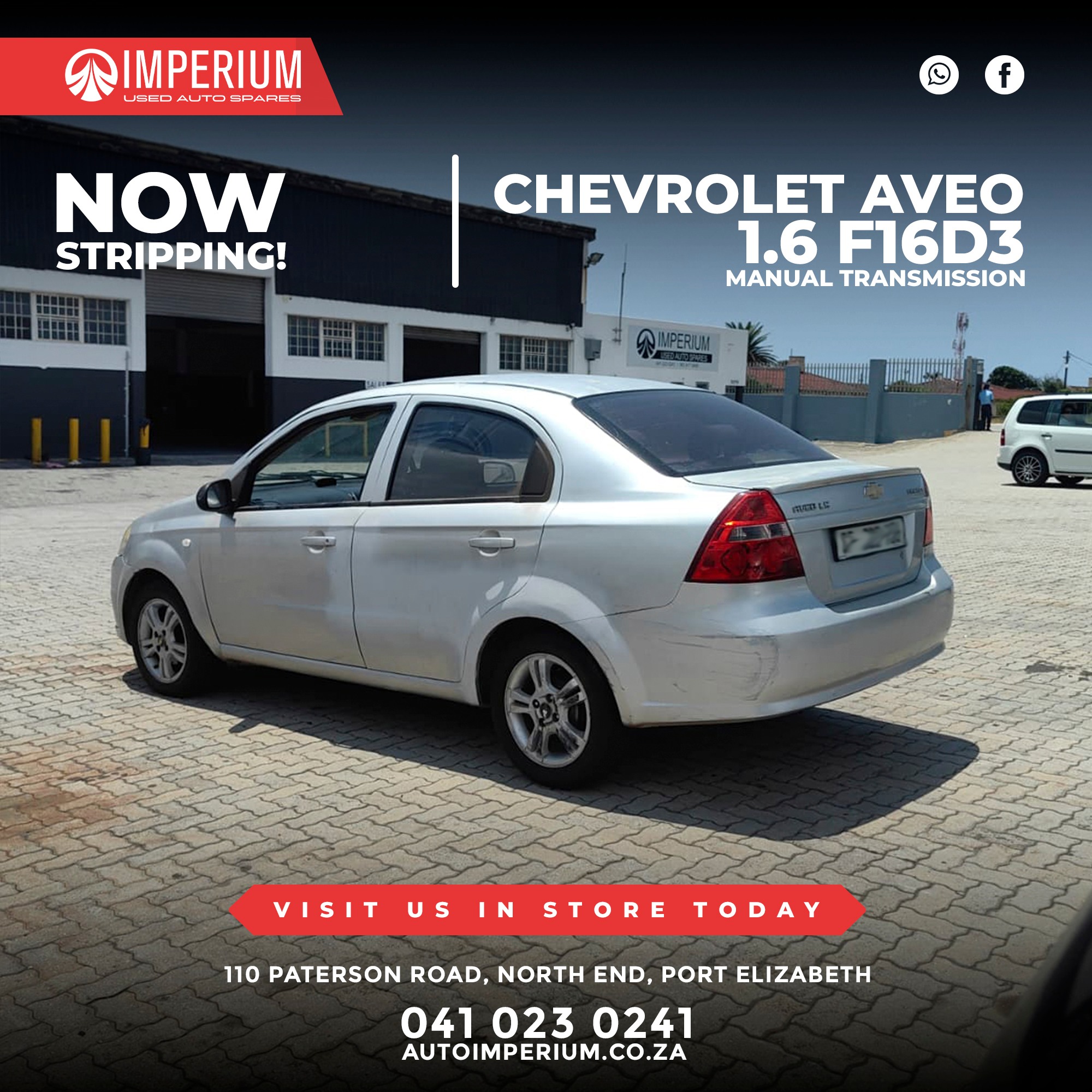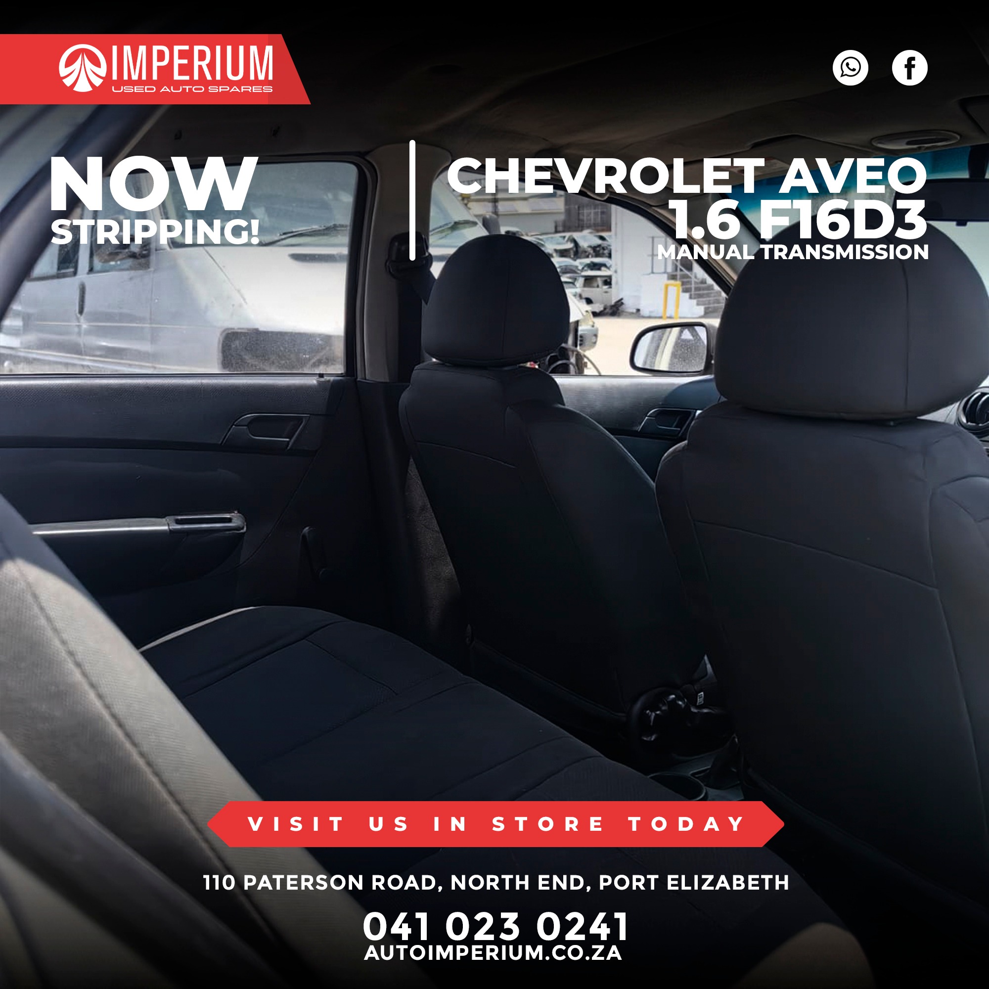 This Chevrolet Aveo 1.6 F16D31 with Manual Transmission is currently being stripped for used parts. A wide range of original Chevrolet components will be available, ideal for repairs or replacements.