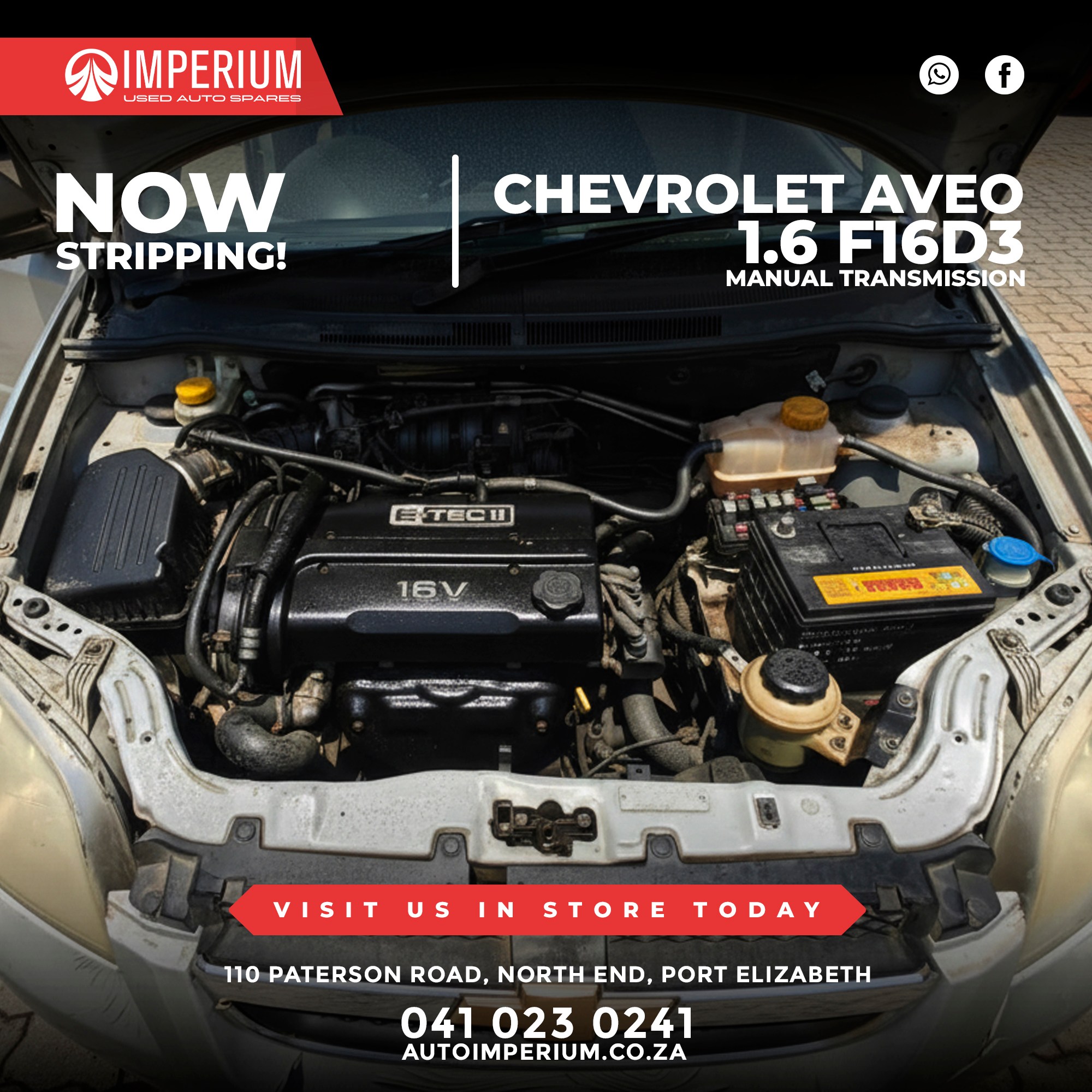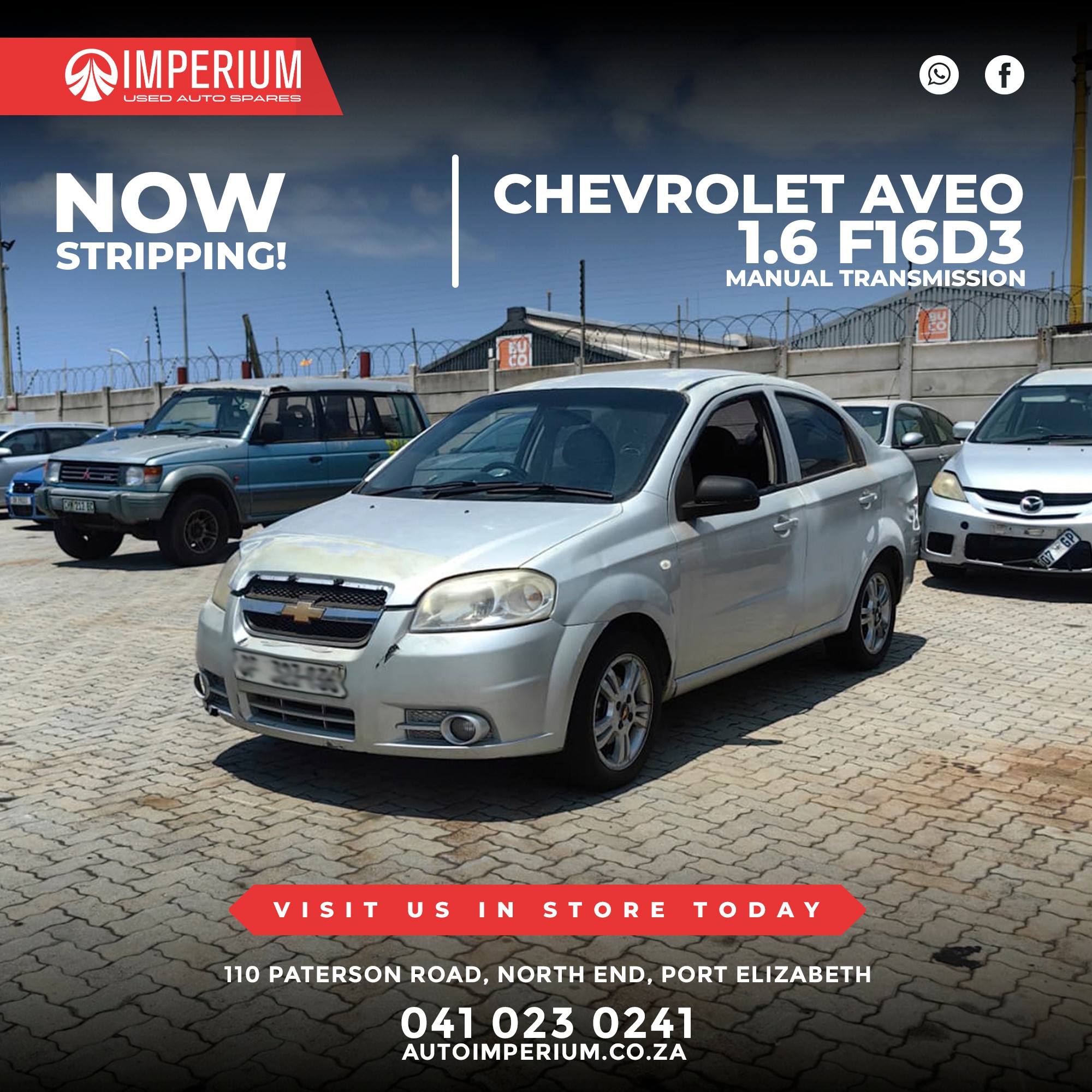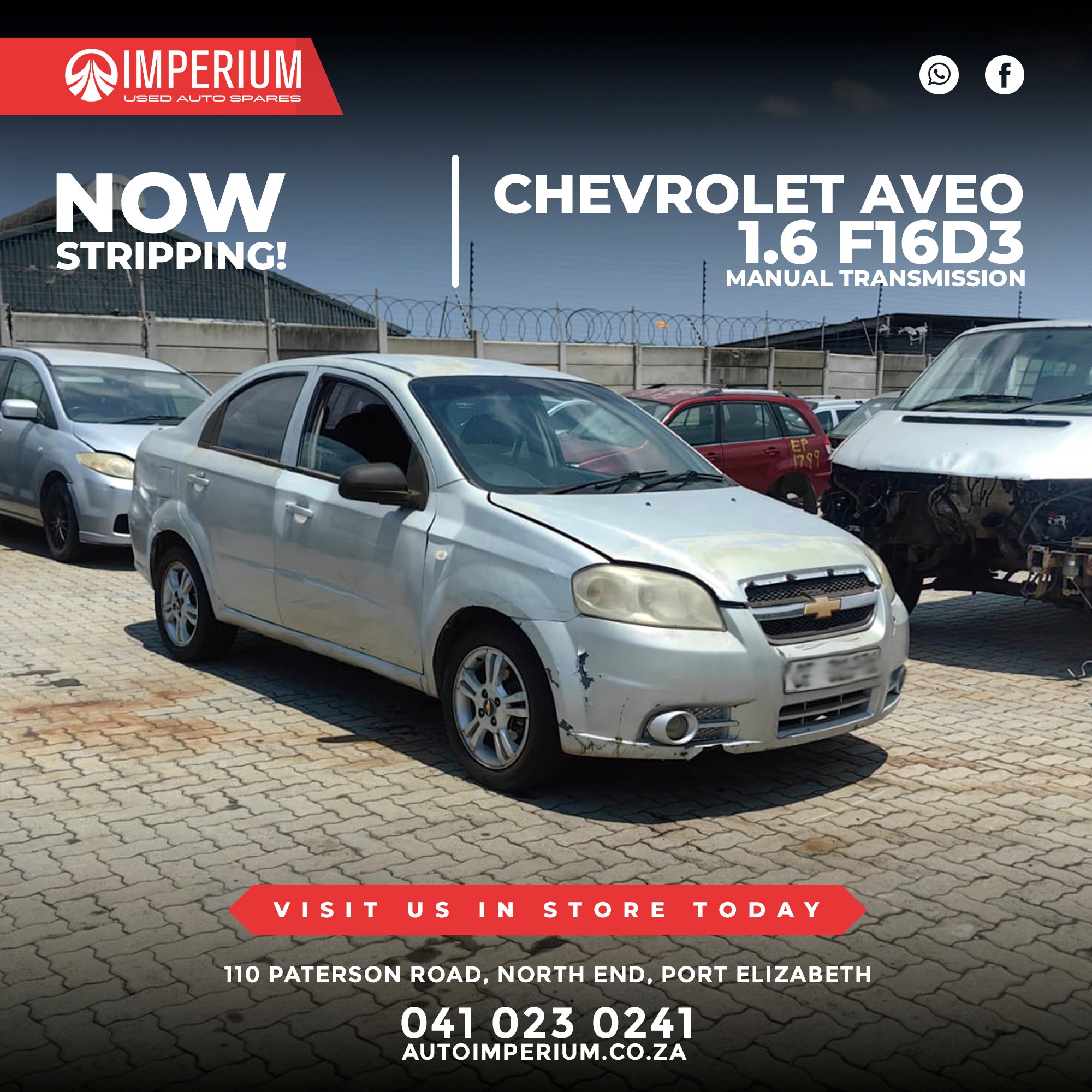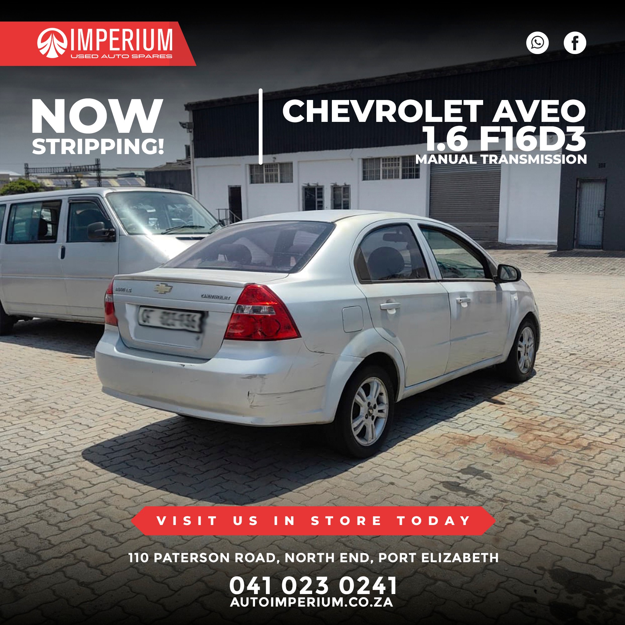 This Chevrolet Aveo 1.6 F16D31 with Manual Transmission is currently being stripped for used parts. A wide range of original Chevrolet components will be available, ideal for repairs or replacements.