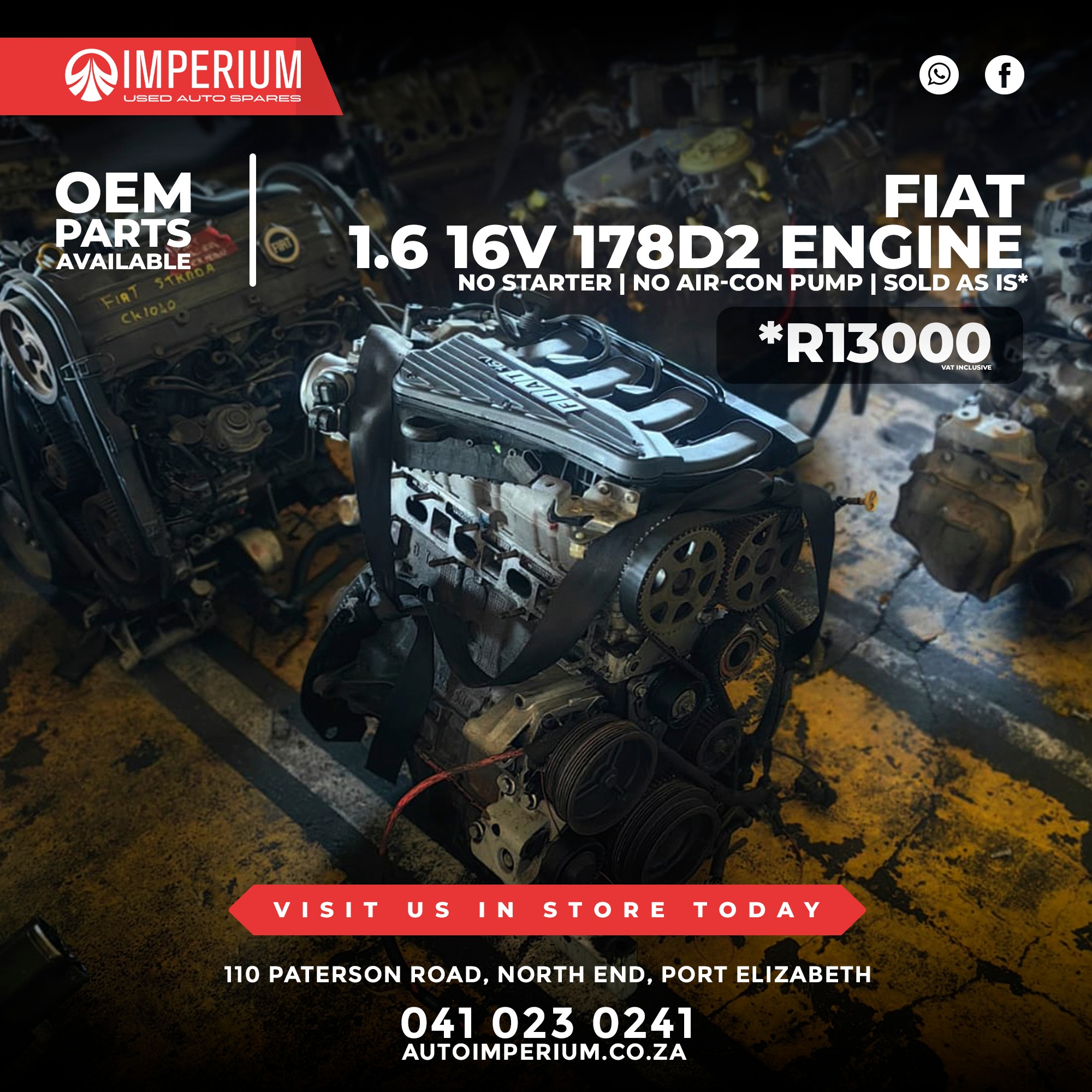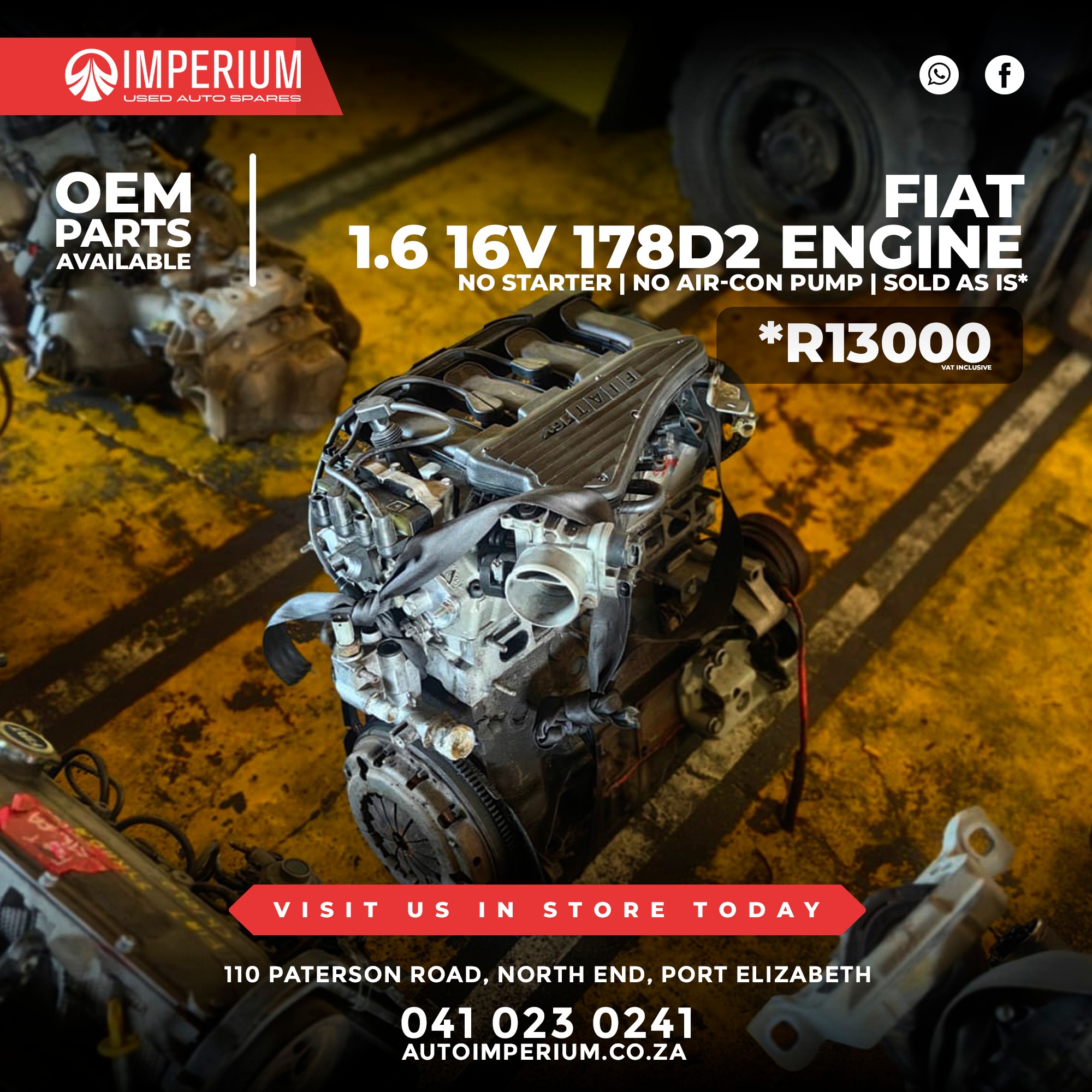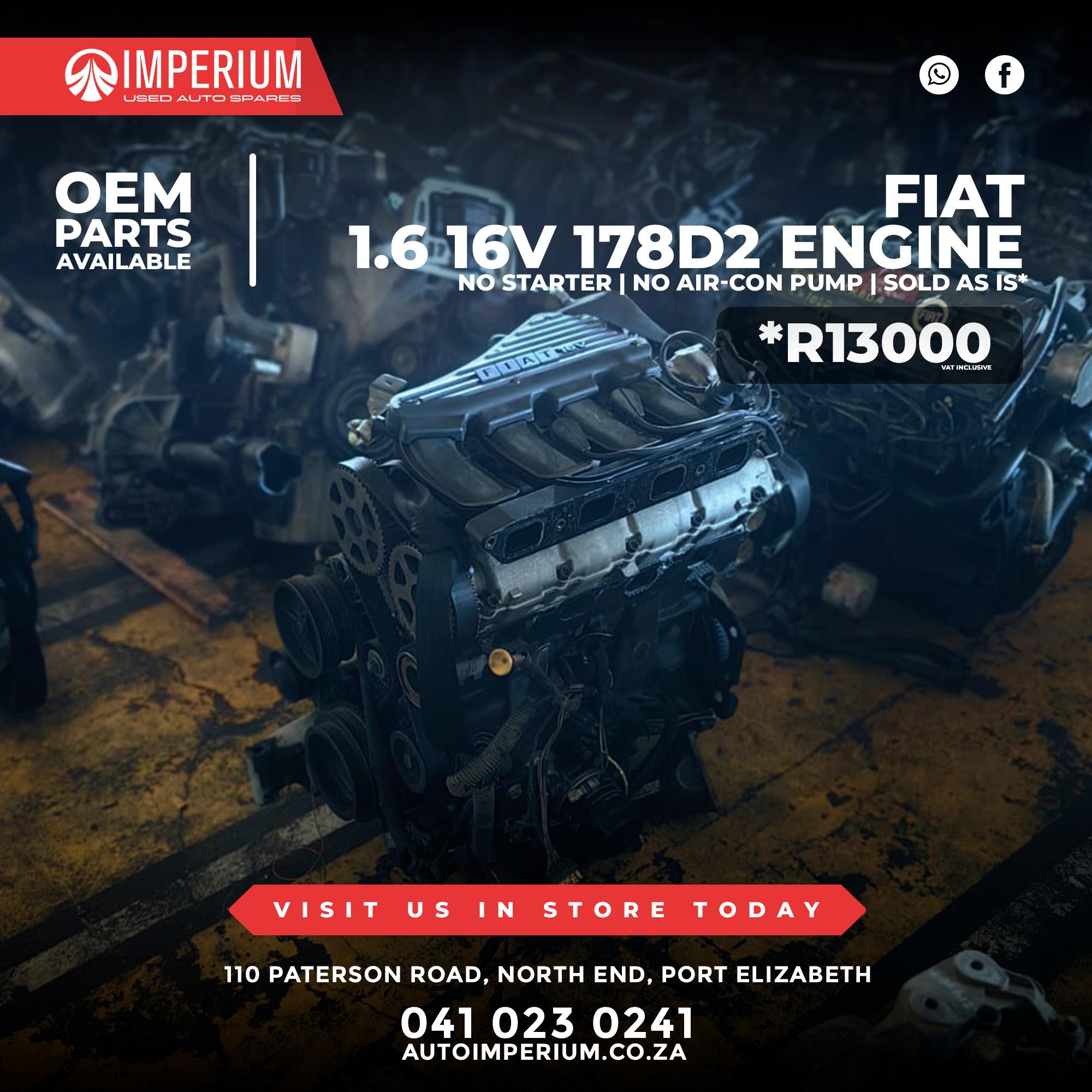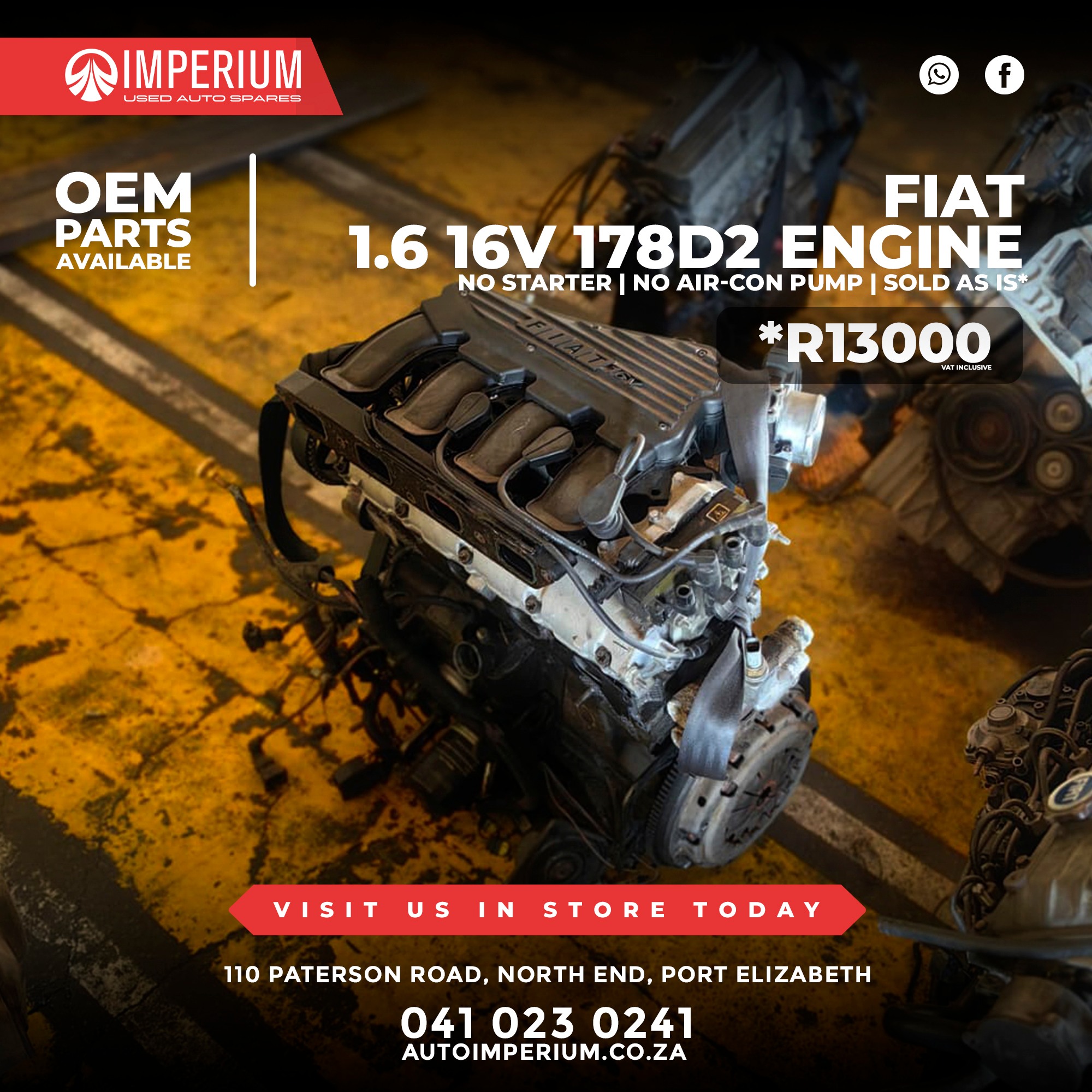 This is a used Fiat 1.6 16V 178D2 Engine fitted with the 178D2 engine code, available from our Paterson Road branch in North End. Ideal for replacements or rebuild projects.