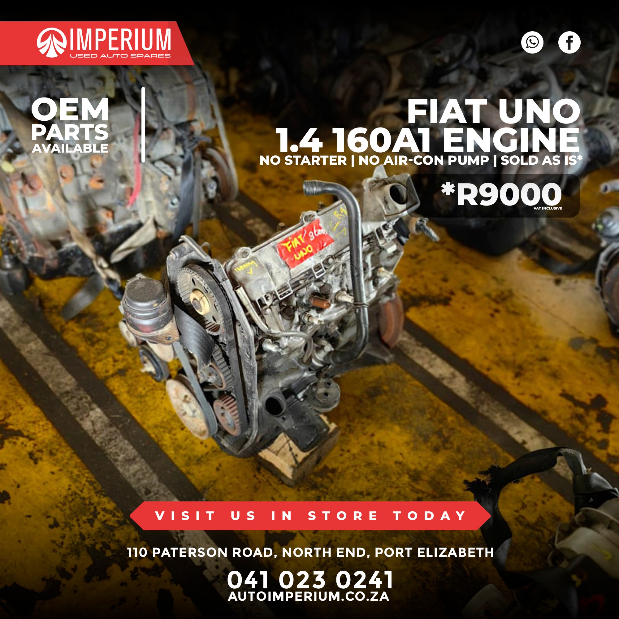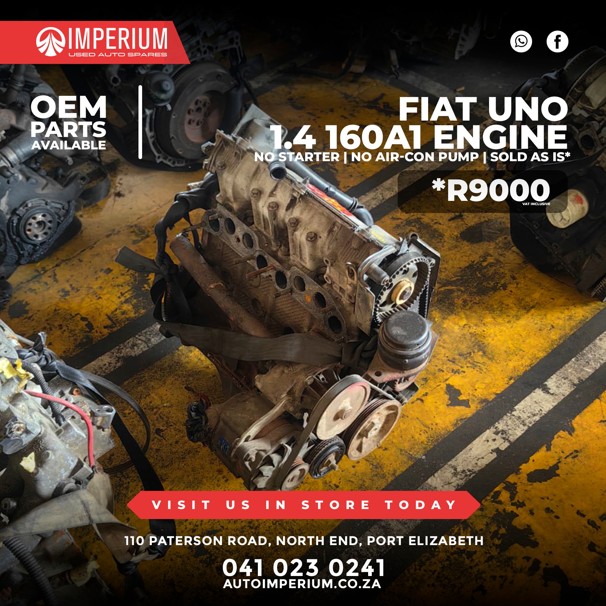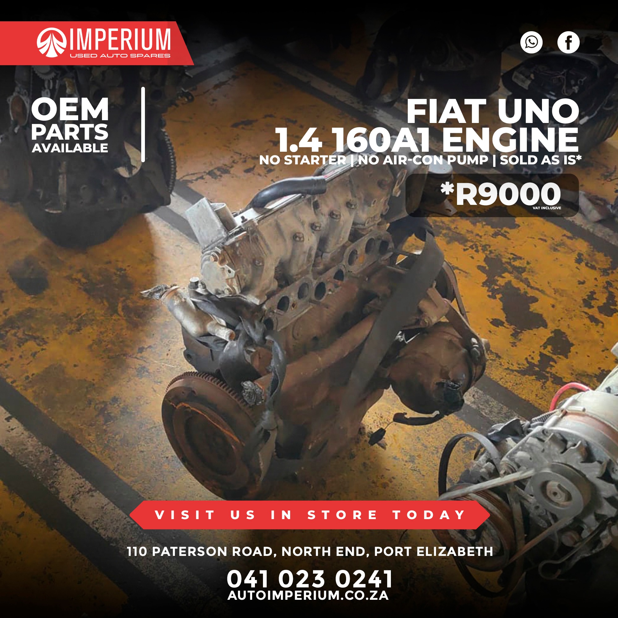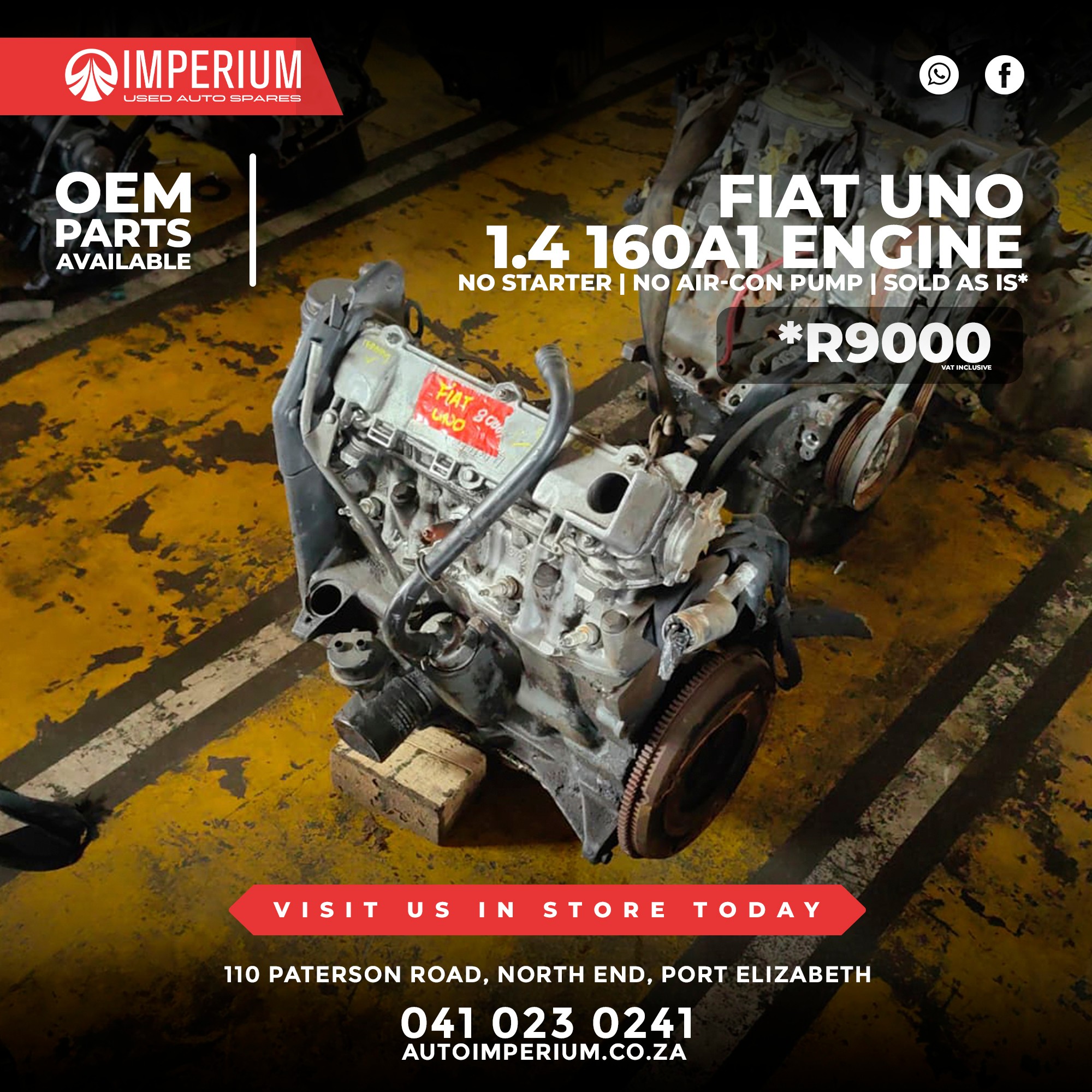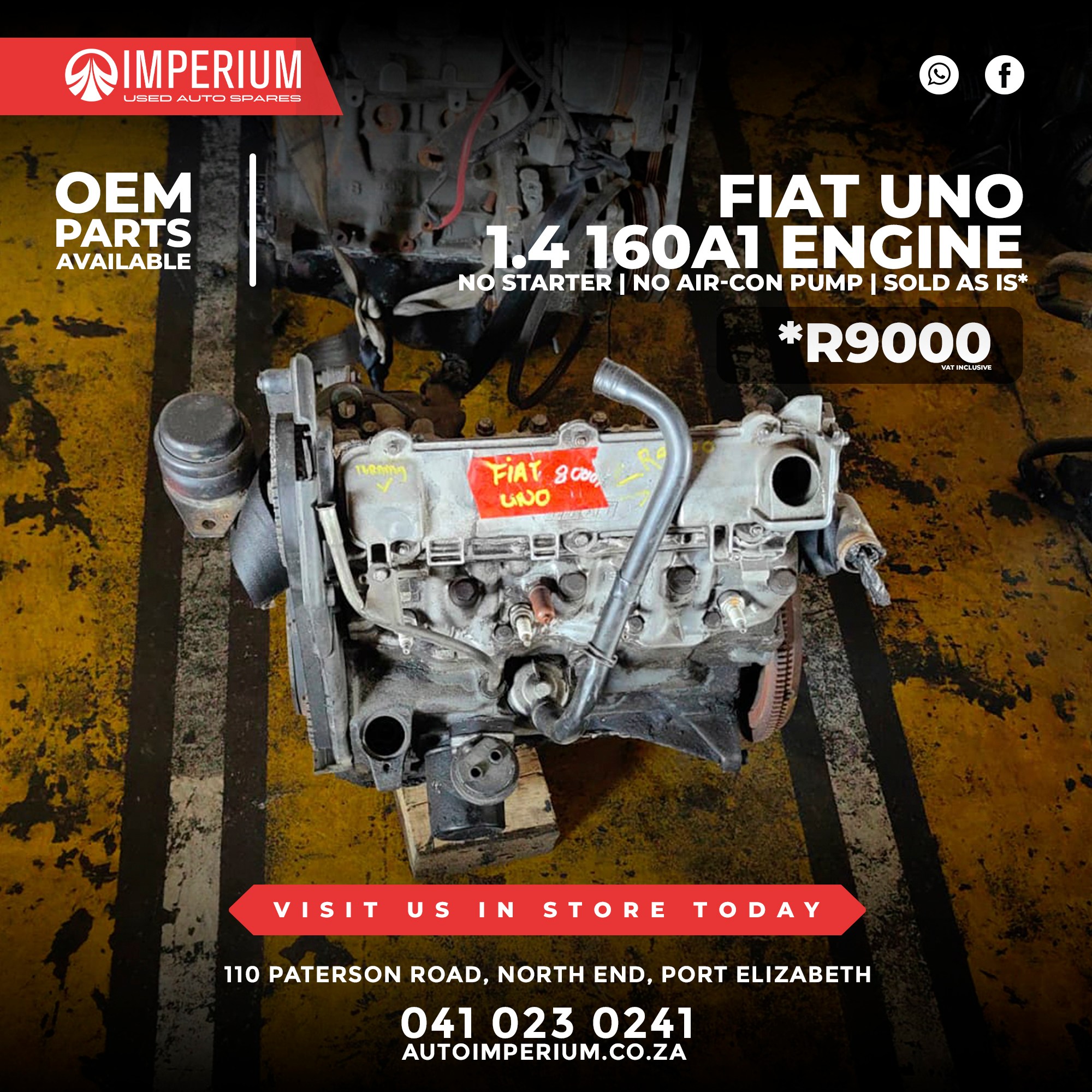 This is a used Fiat Uno 1.4 160A1 Engine fitted with the 160A1 engine code, available from our Paterson Road branch in North End. Ideal for replacements or rebuild projects.
