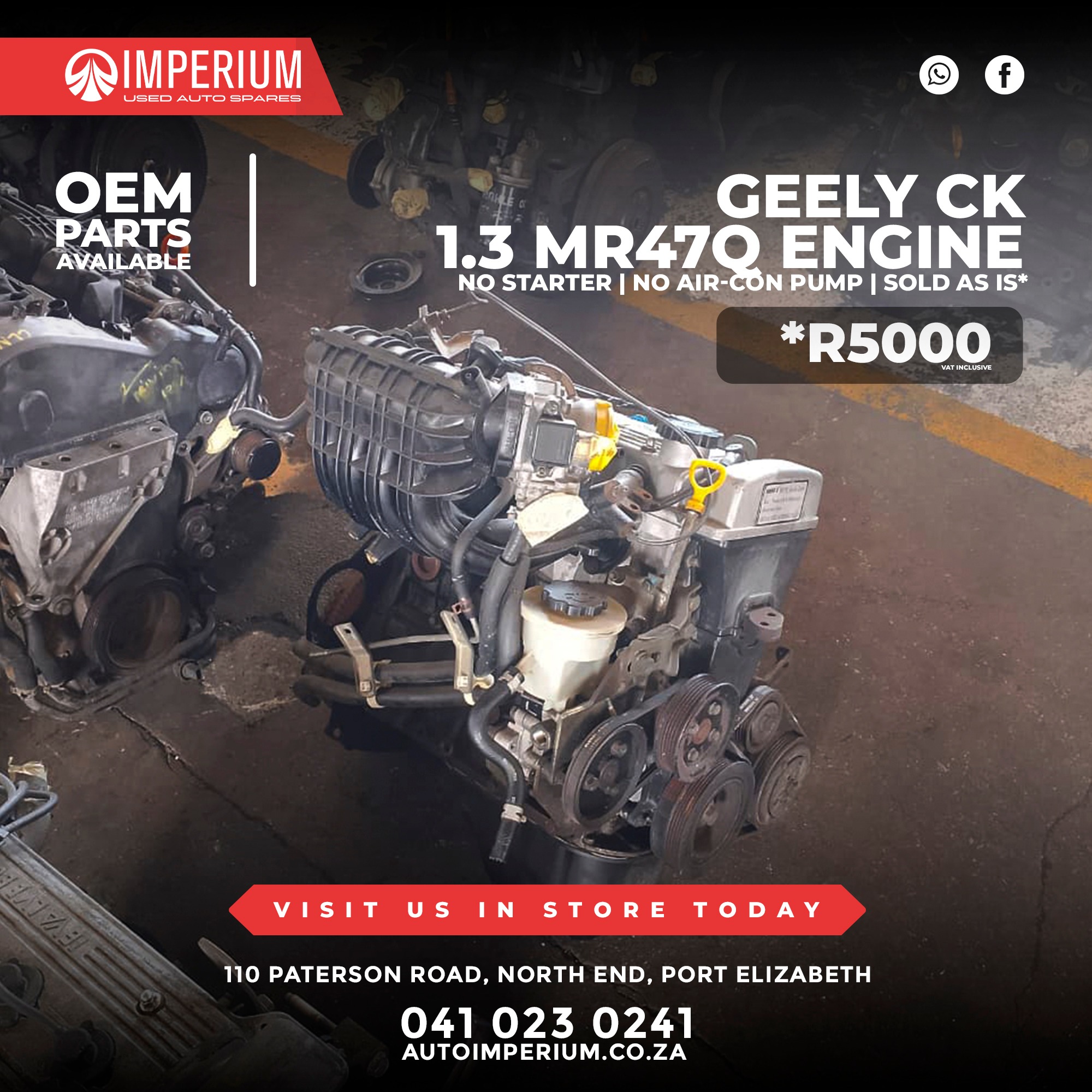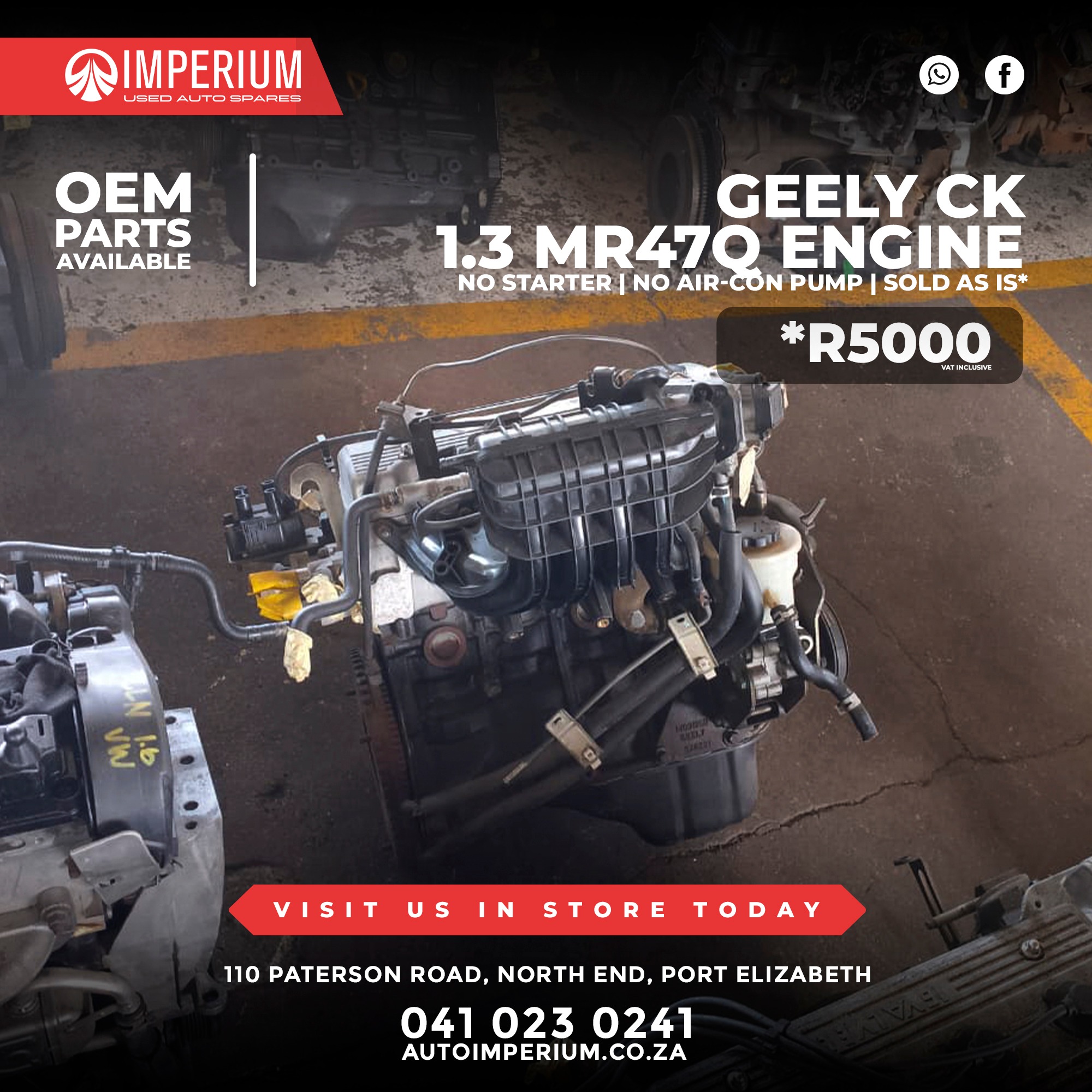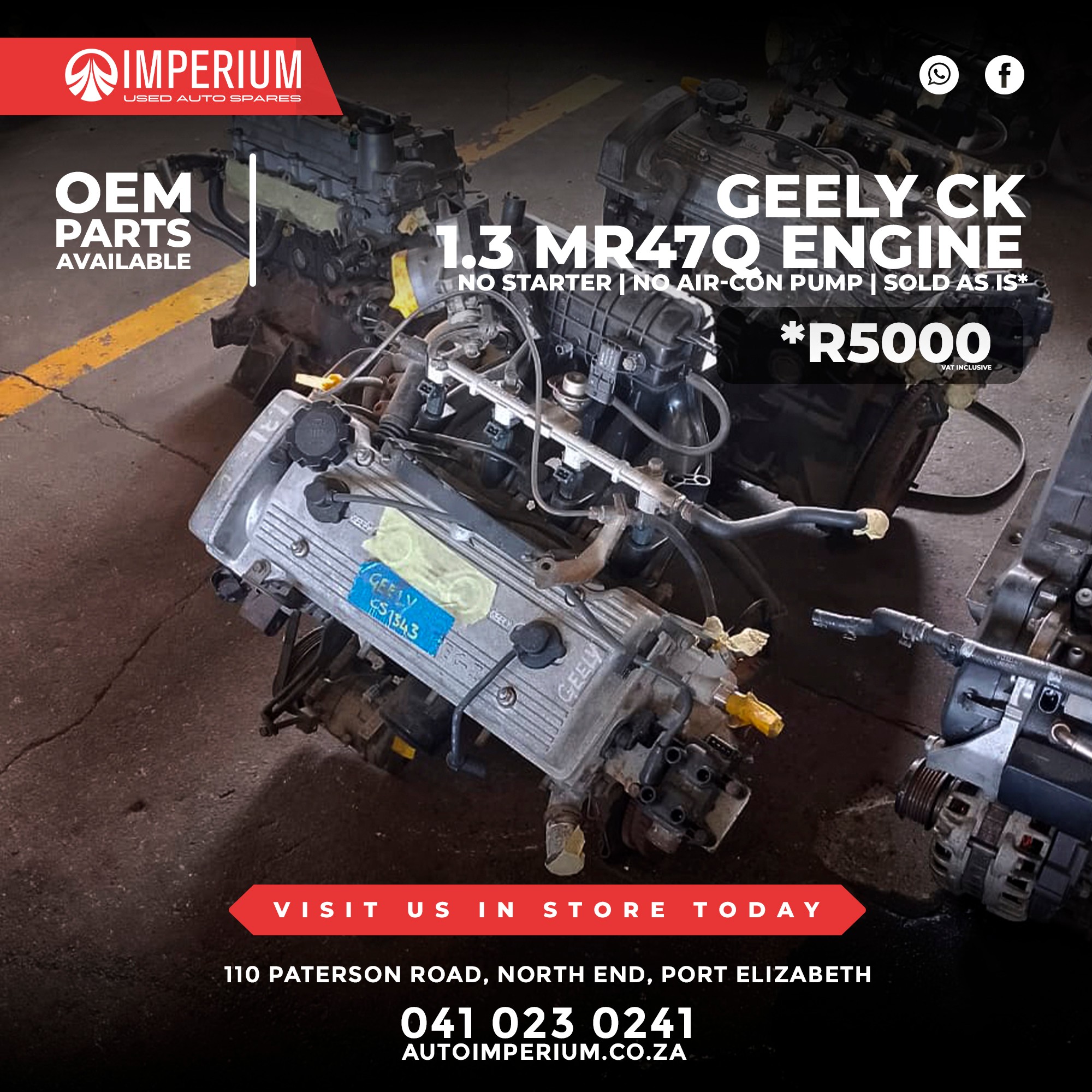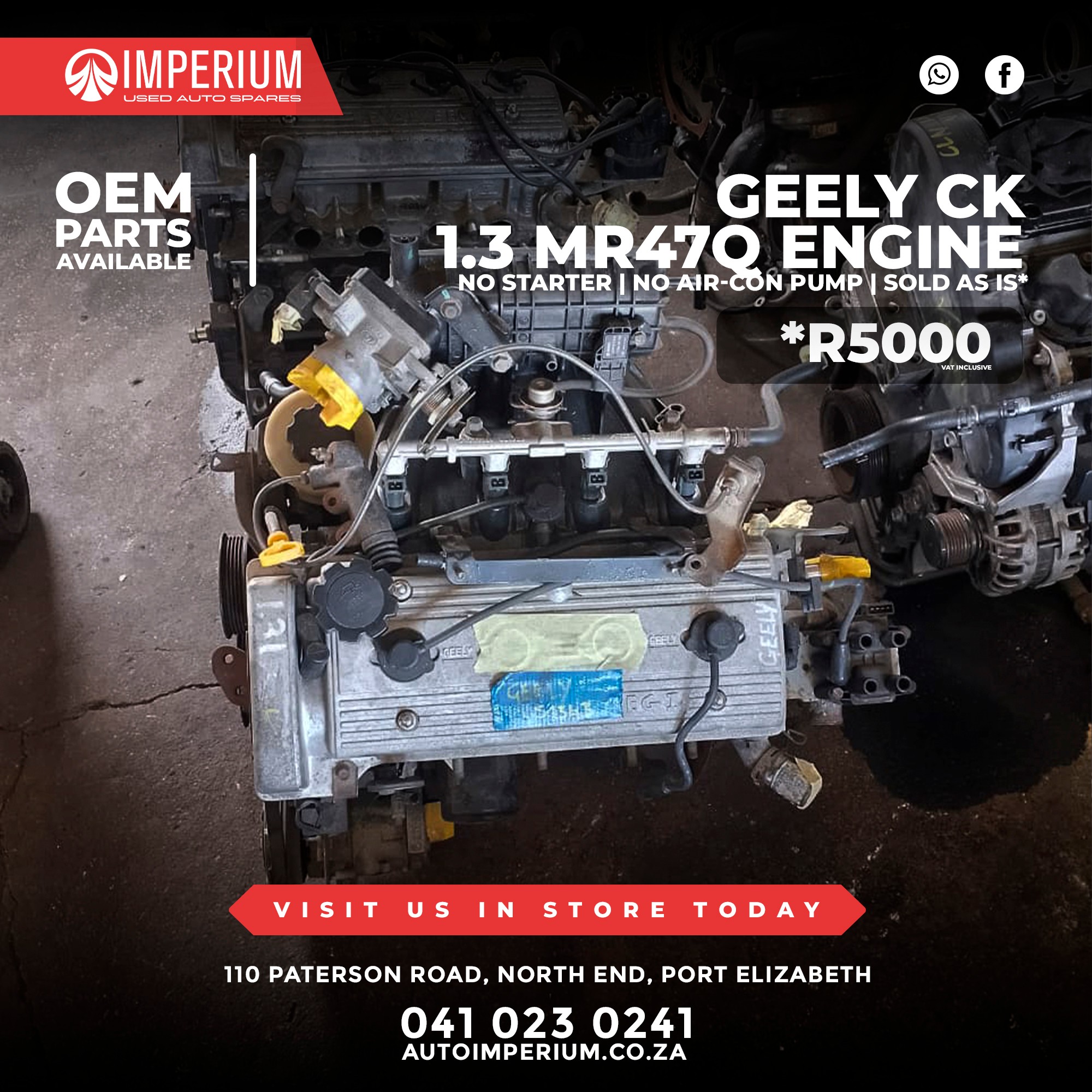 This is a used Geely CK 1.3 MR47Q Engine fitted with the MR47Q engine code, available from our Paterson Road branch in North End. Ideal for replacements or rebuild projects.