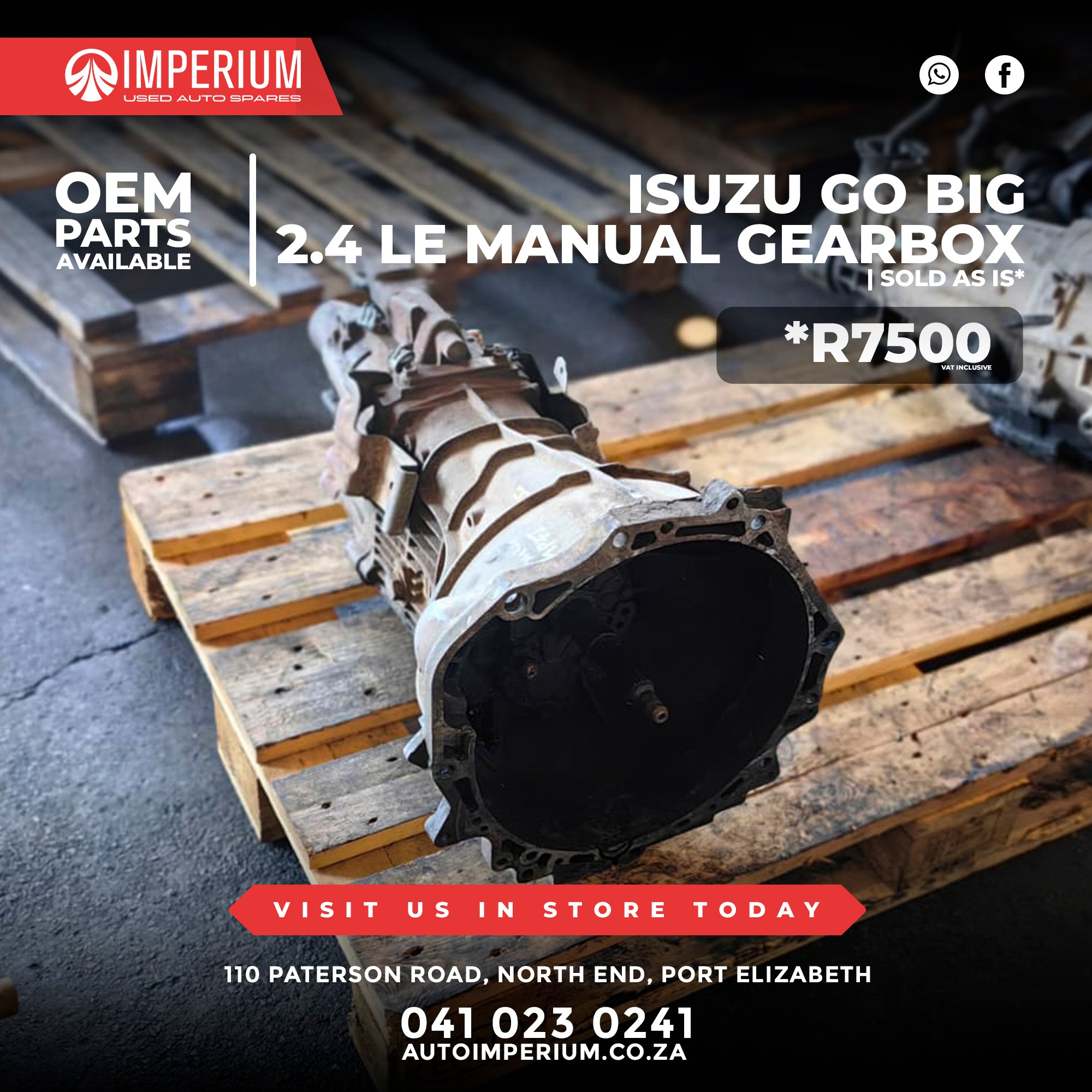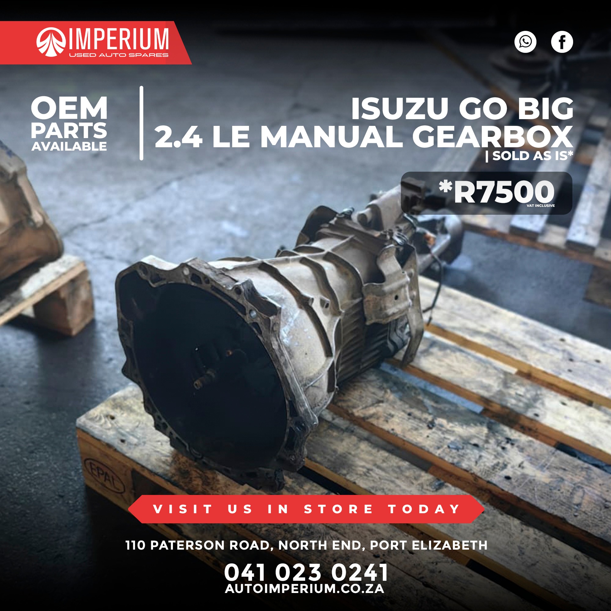This is a used Isuzu Go Big 2.4 LE Manual Gearbox, available from our Paterson Road branch in North End. Ideal for replacements or rebuild projects.