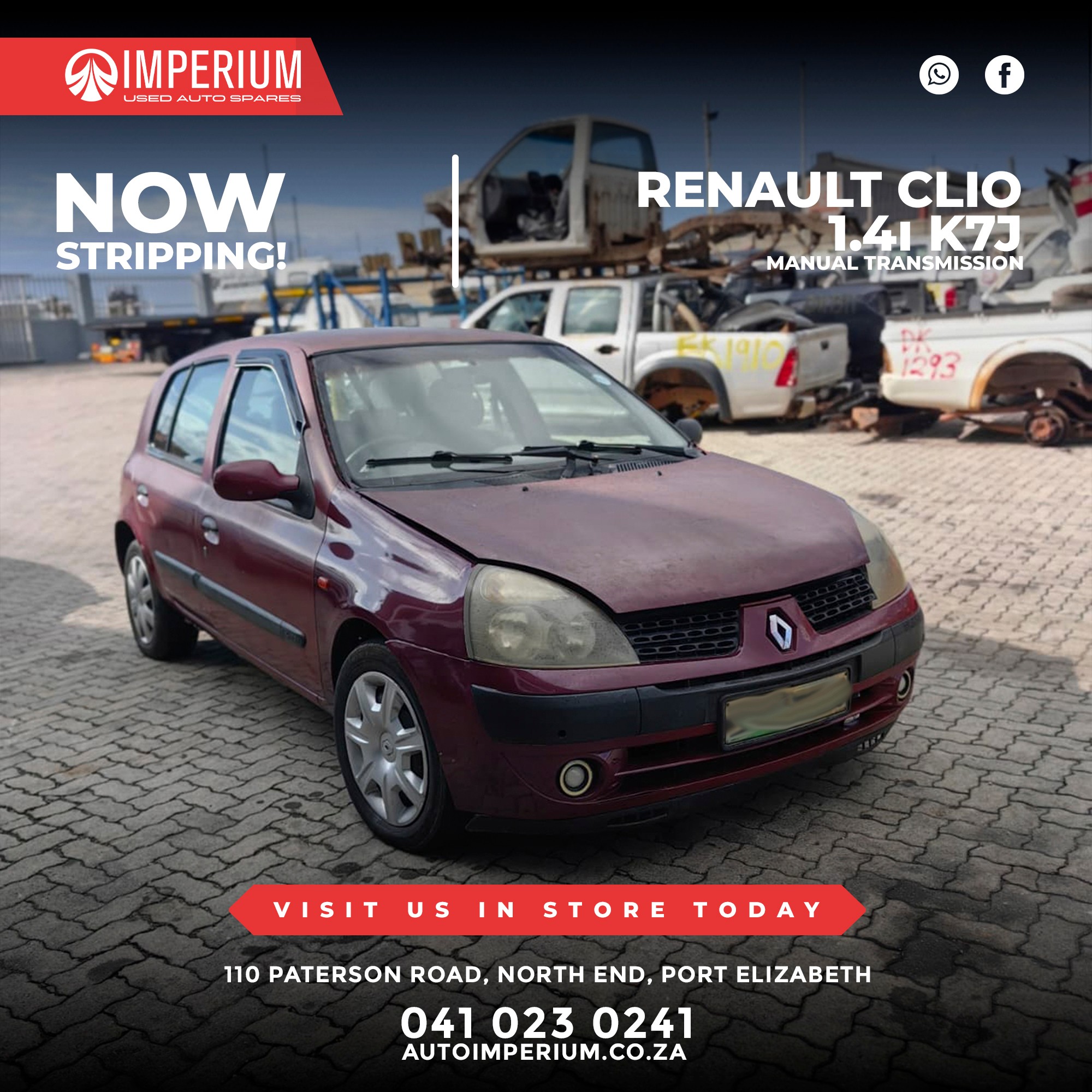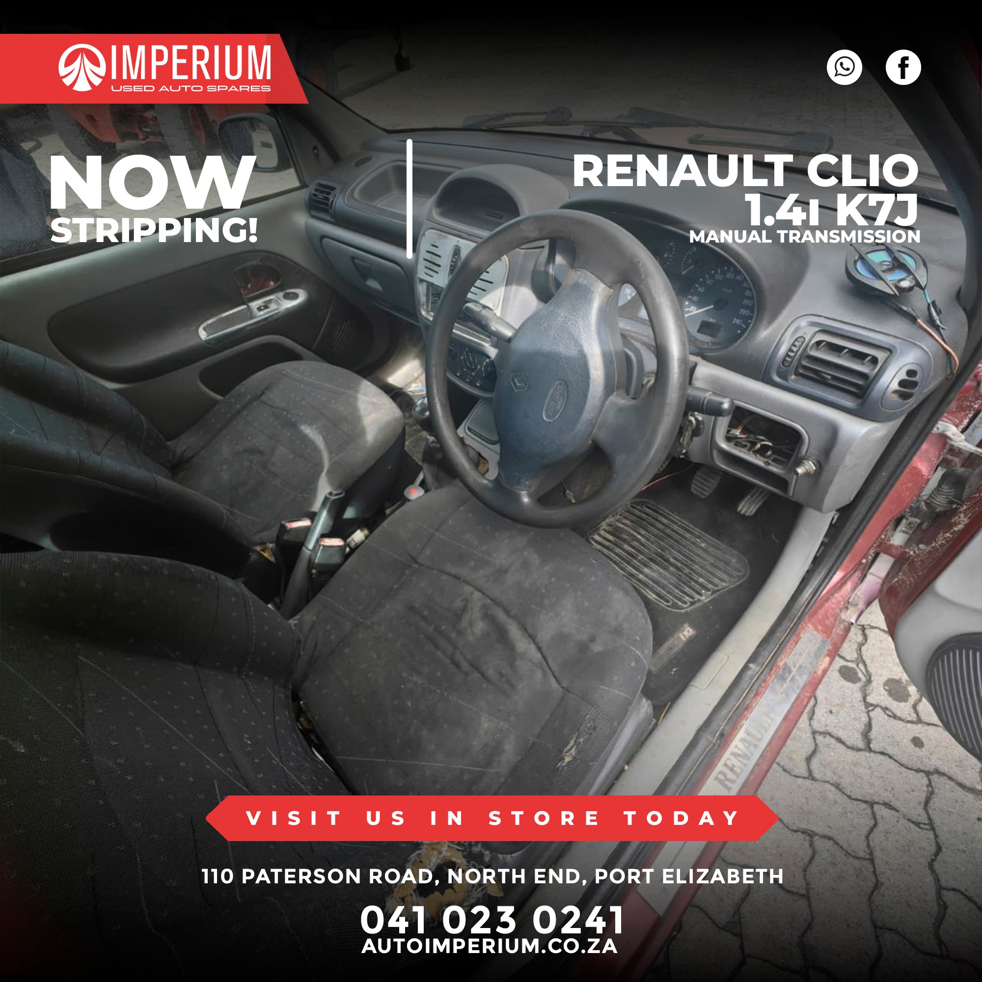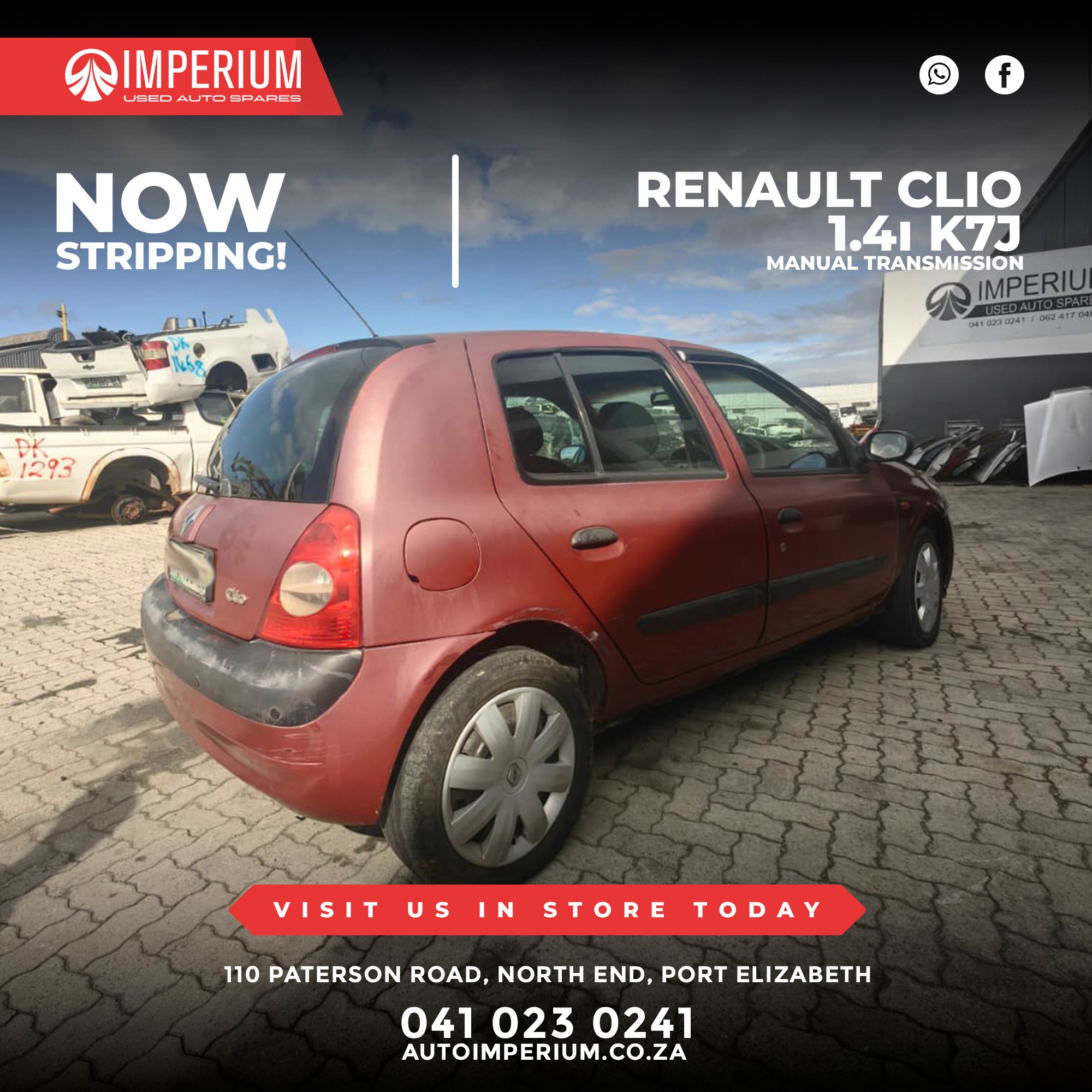 This Renault Clio 1.4i K7J is currently being stripped for used parts. A wide range of original Renault components will be available, ideal for repairs or replacements.