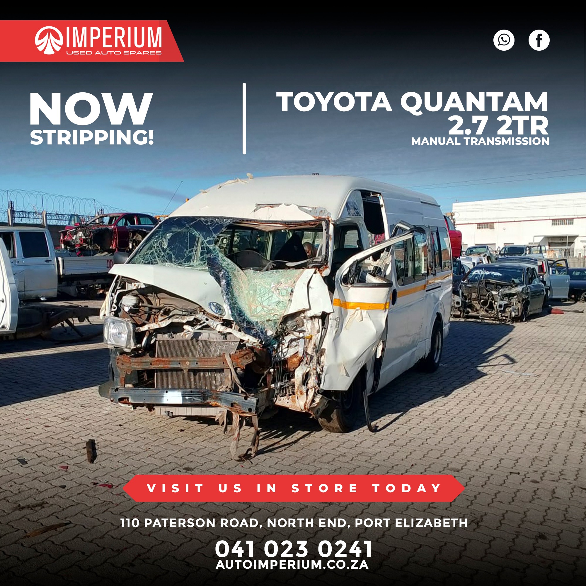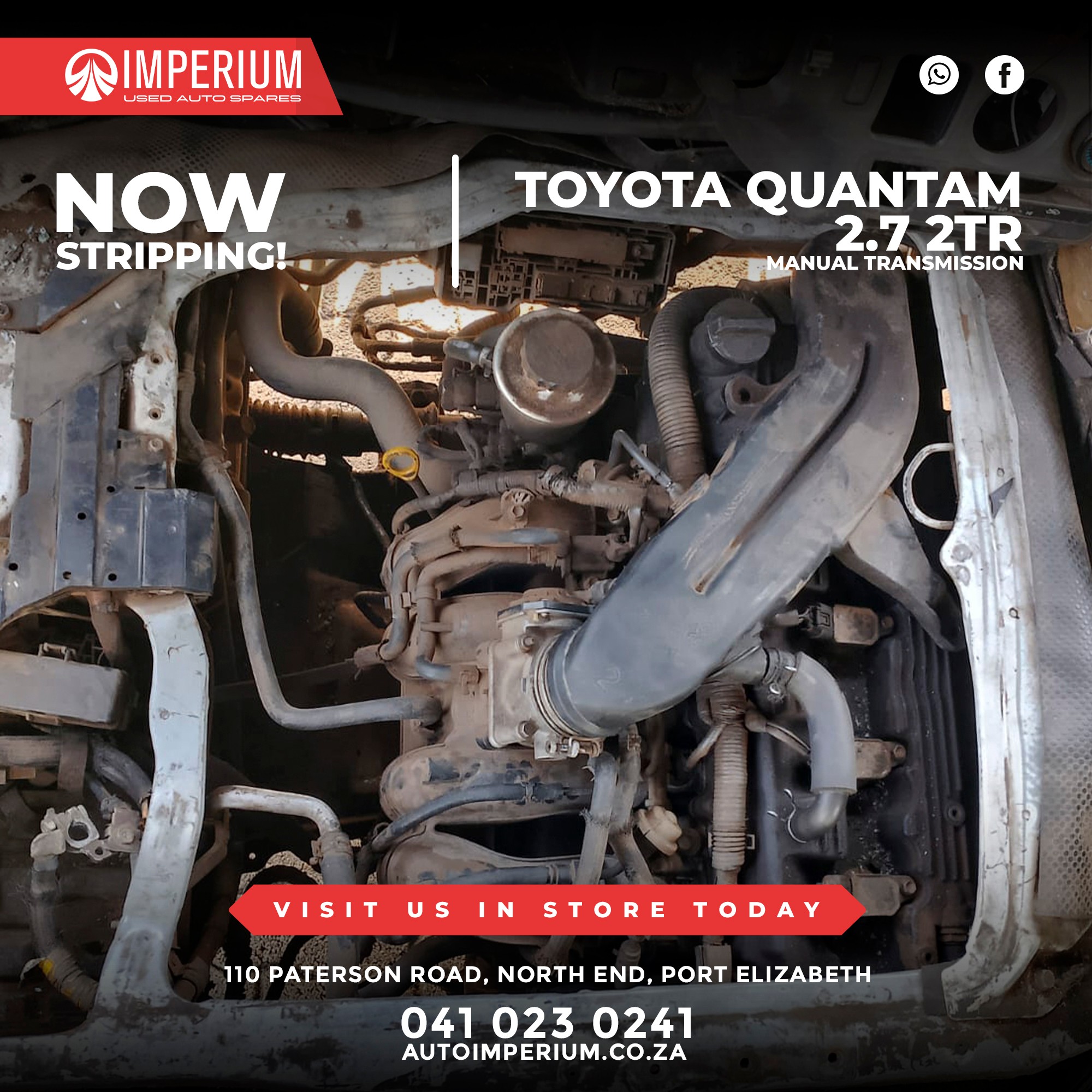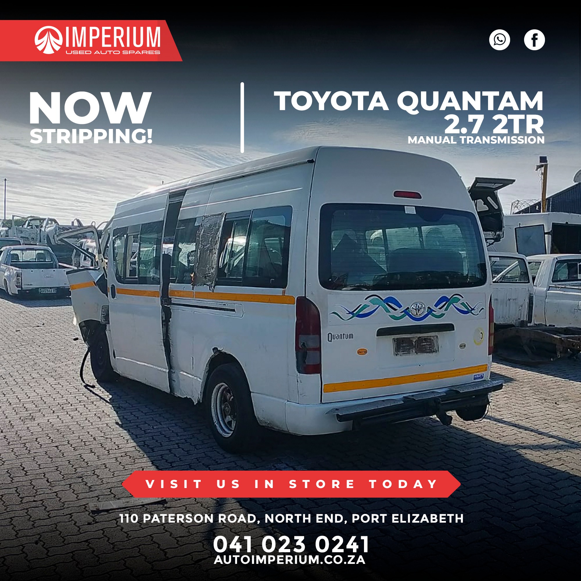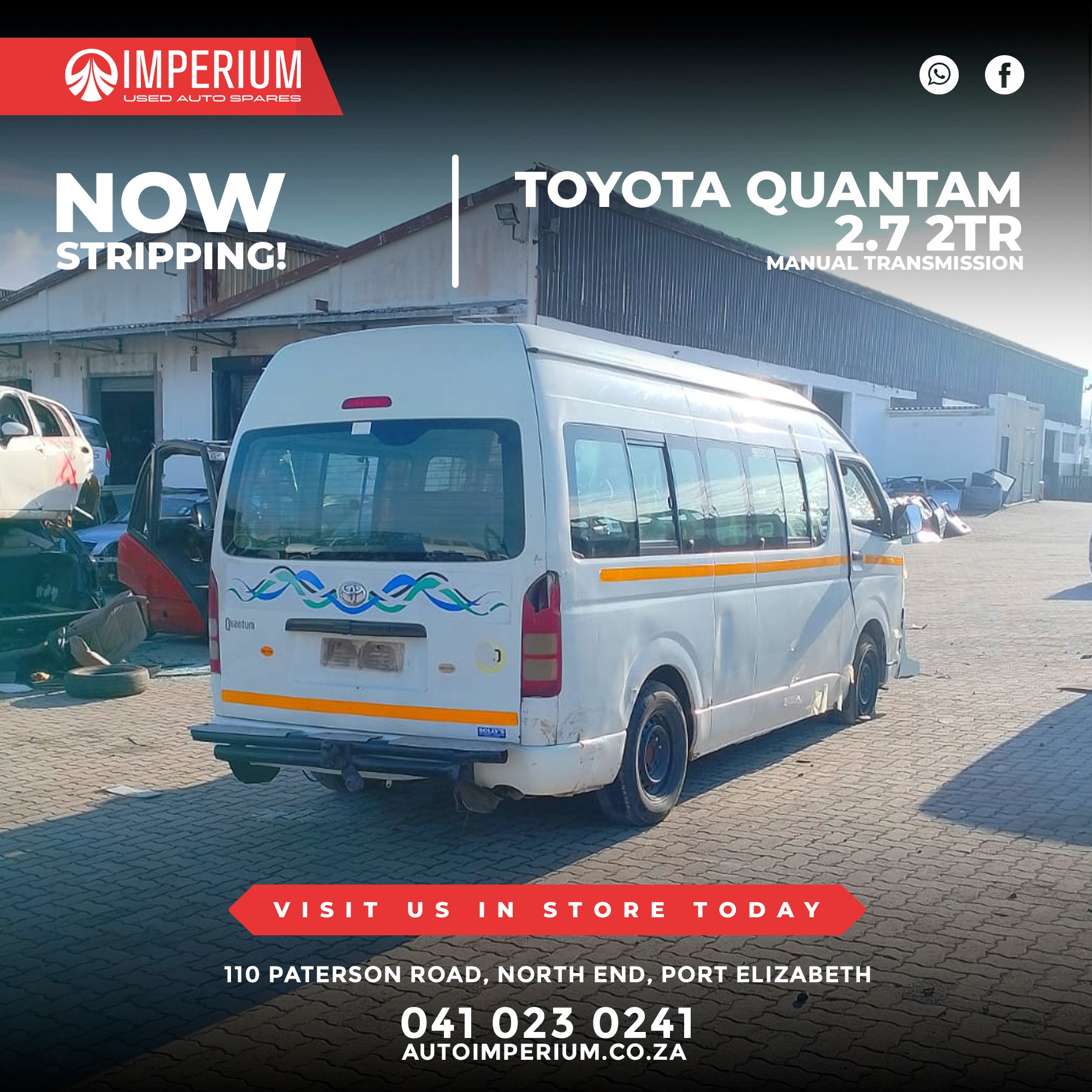 This Toyota Quantum 2.7 2TR is currently being stripped for used parts. A wide range of original Toyota components will be available, ideal for repairs or replacements.
