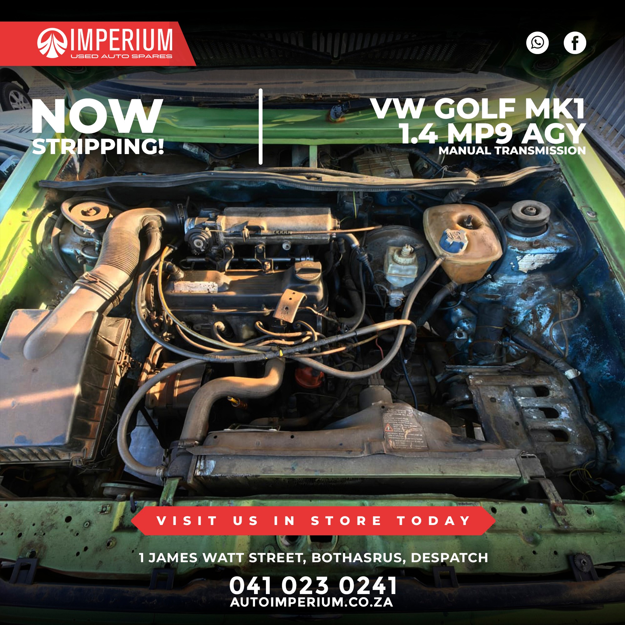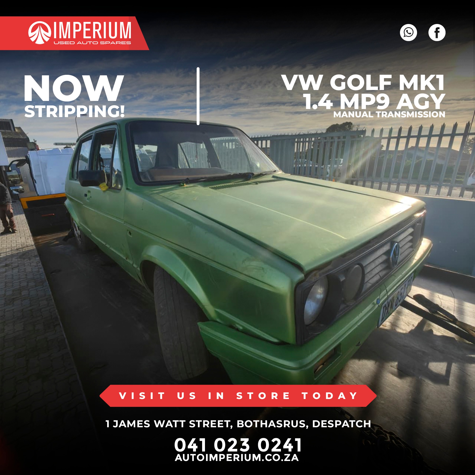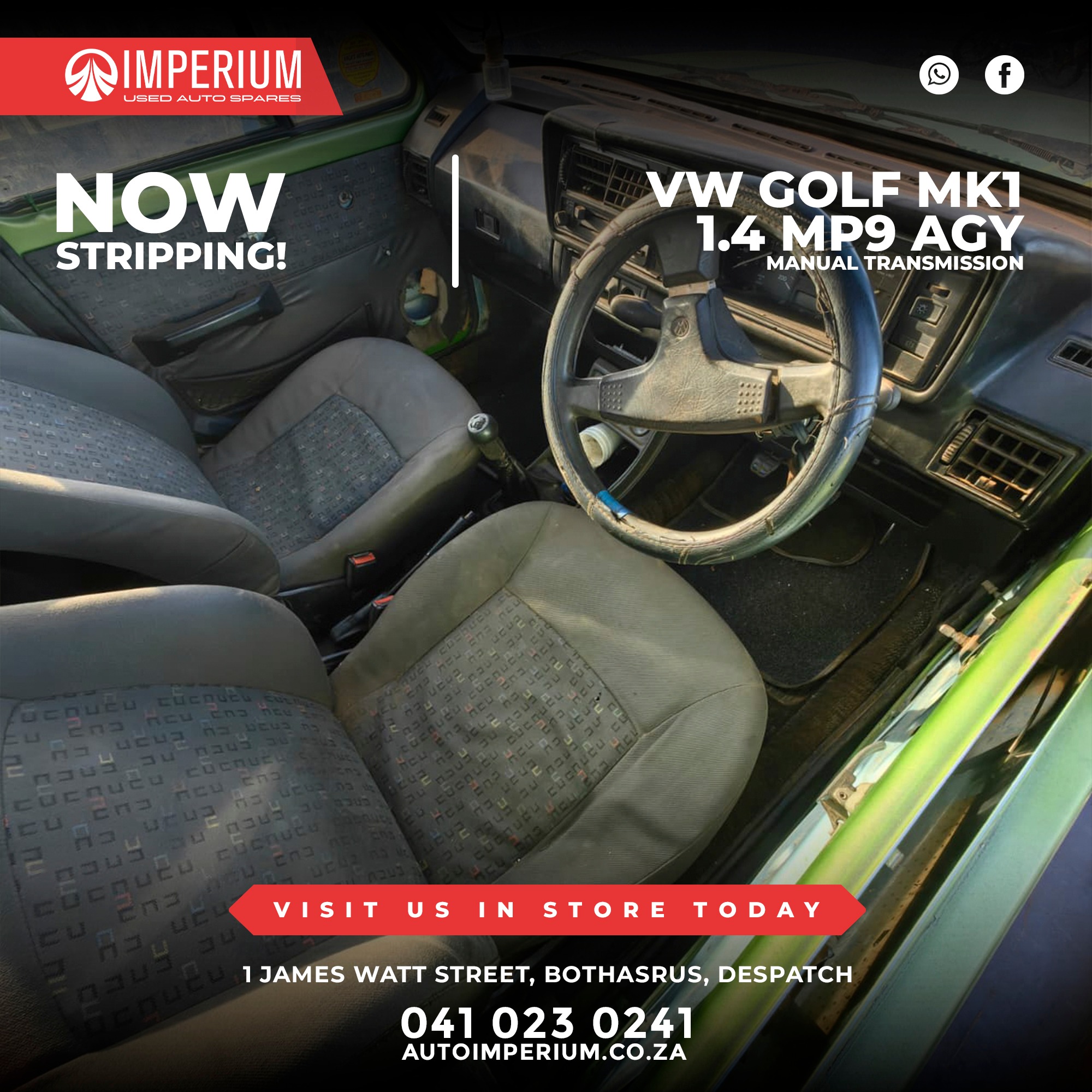This Volkswagen Golf Mk1 1.4 MP9 AGY is currently being stripped for used parts. A wide range of original Volkswagen components will be available, ideal for repairs or replacements.