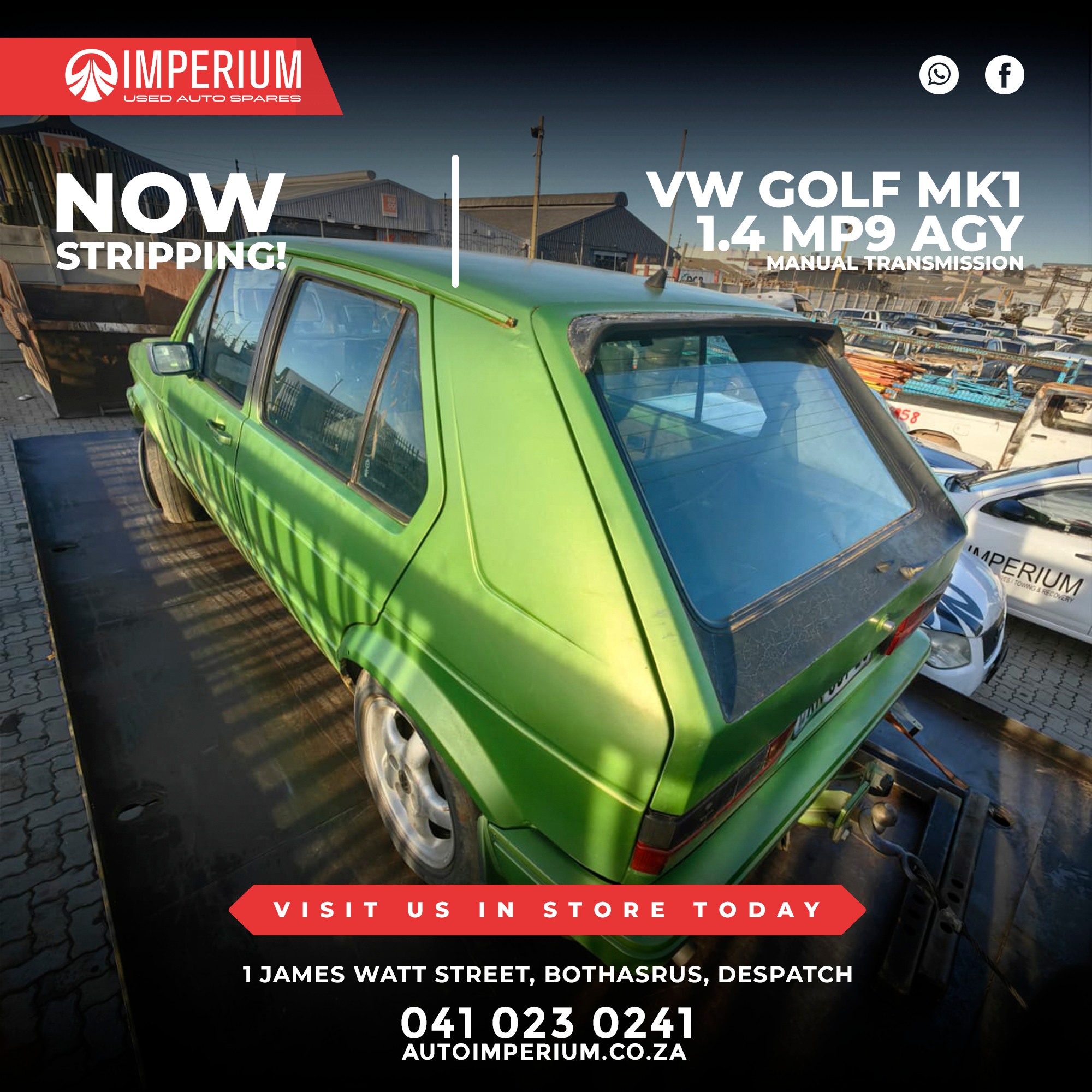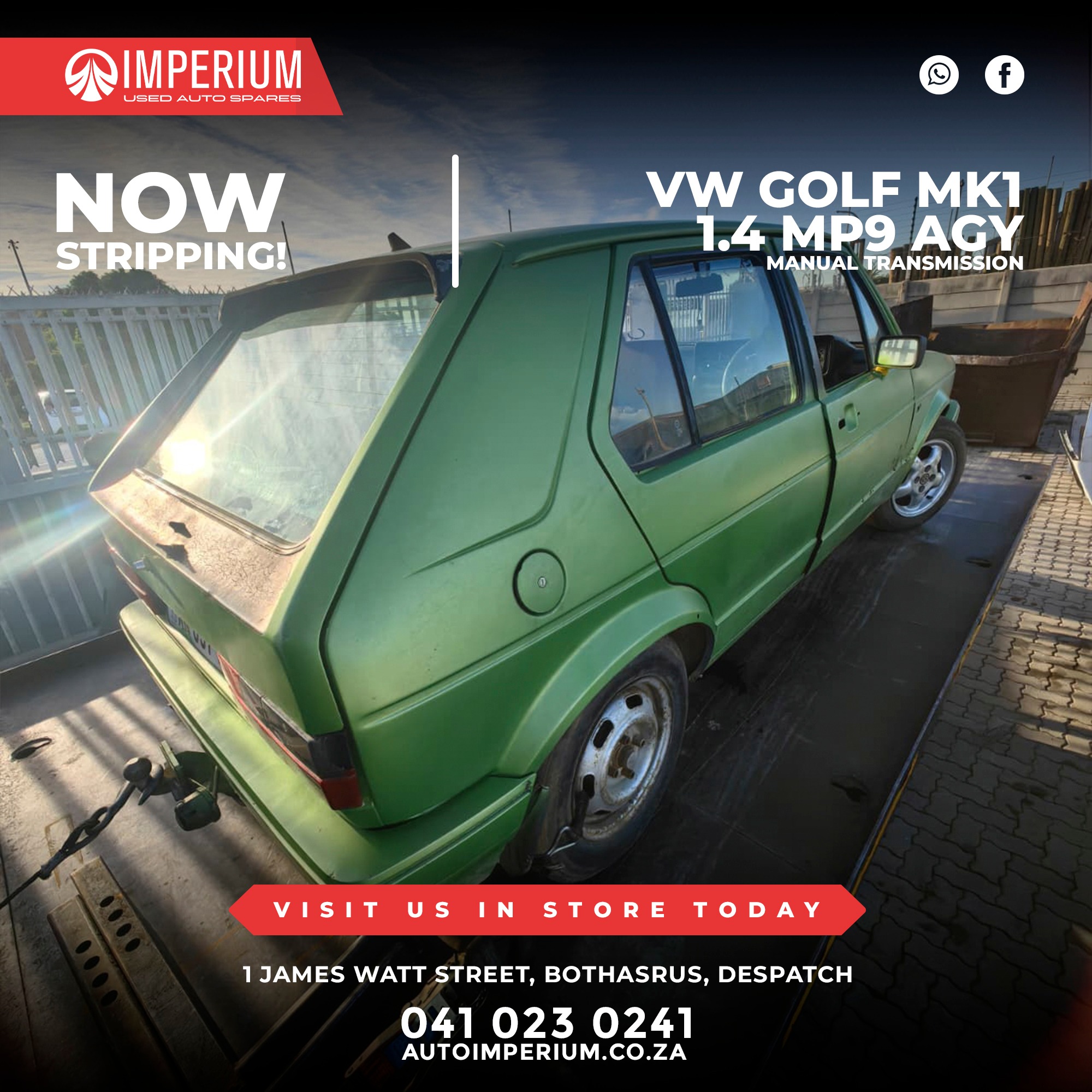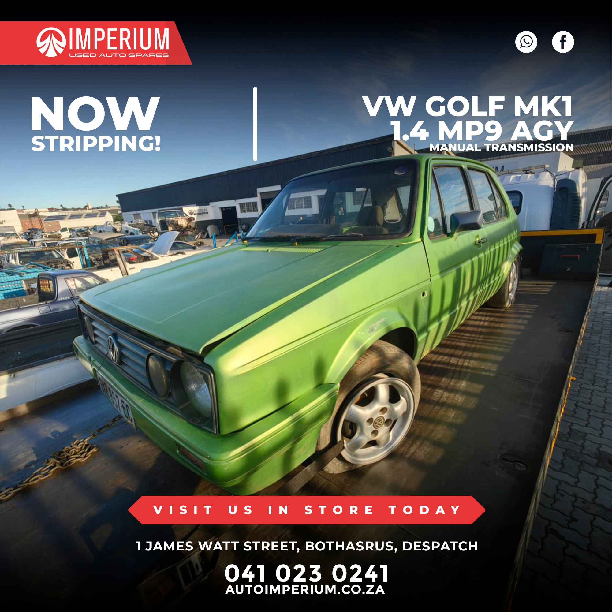 This Volkswagen Golf Mk1 1.4 MP9 AGY is currently being stripped for used parts. A wide range of original Volkswagen components will be available, ideal for repairs or replacements.